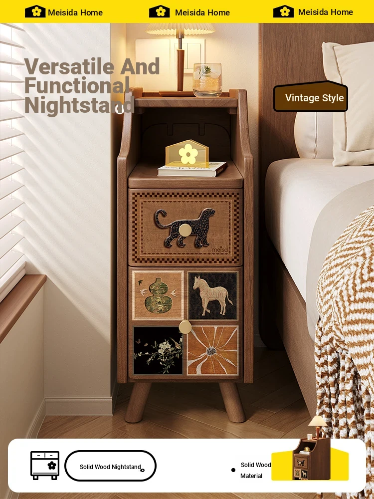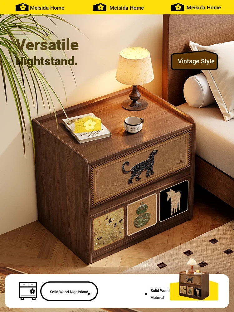Meisida Solid Wood Nightstand - Creative Vintage Design for Home Use, 2025 New Walnut Color Retro Bedside Cabinet for Your Bedroom