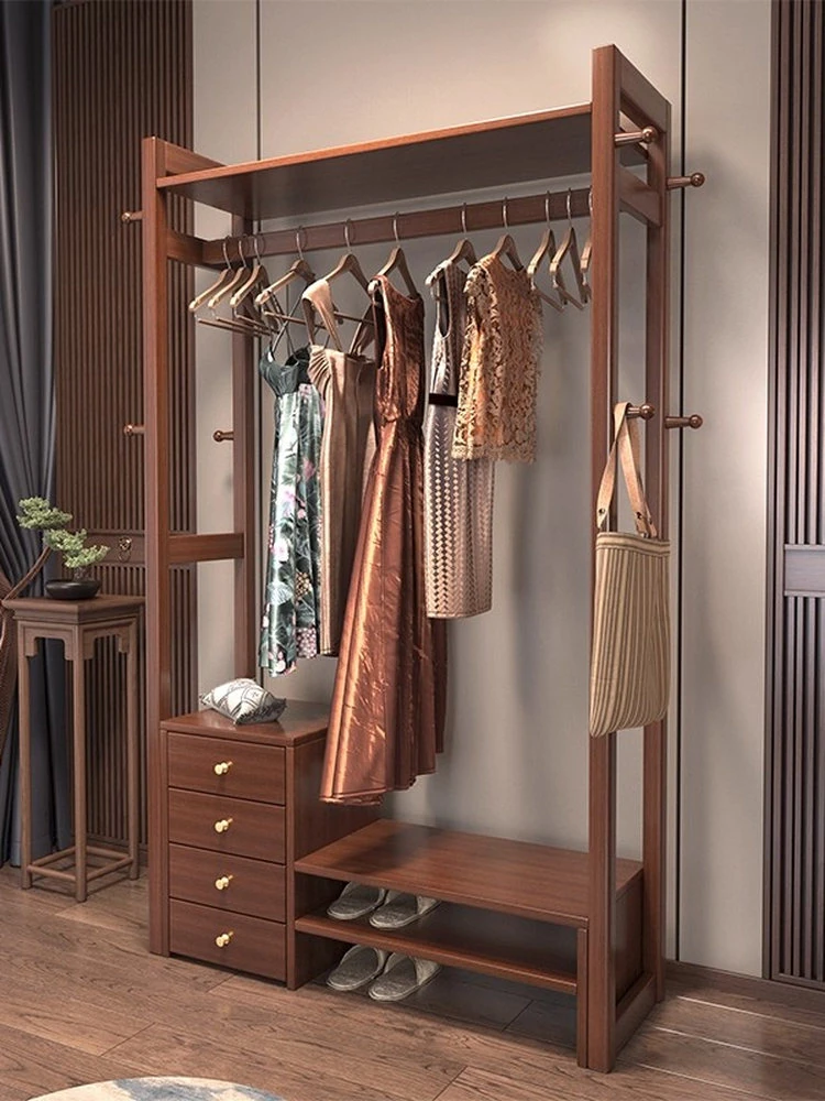 美世达実木製フロアコートハンガー - ベッドルームやリビングに最適!座れる便利なシューズラック付き、引き出し付きの多機能新中式ハンガーで、スタイリッシュな収納を実現!