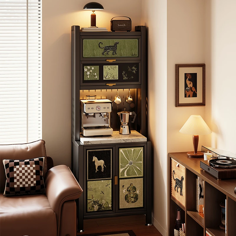 美世达カーボンスチール製アンティーク風ウォールサイド収納キャビネット - ヴィンテージなアイロンフレームとレザー仕上げで、客間にスタイリッシュな収納スペースを提供します。ティー&スナックのディスプレイにも最適!