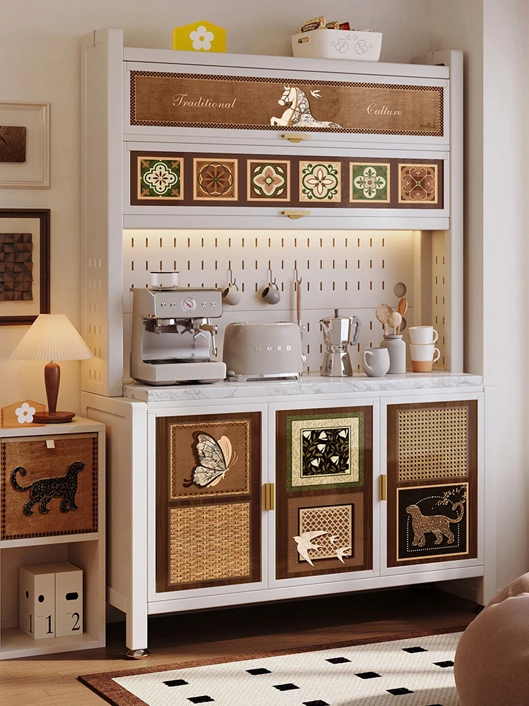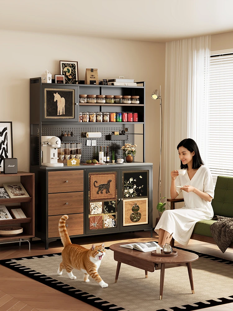 美世达中古スタイルのカーボンスチール製サイドボード - 壁面一体型収納キャビネット、リビングルーム用の耐久性抜群のステンレススチールアイアン製皮革引き出し付き!おしゃれで機能的な収納ソリューションをお届けします。