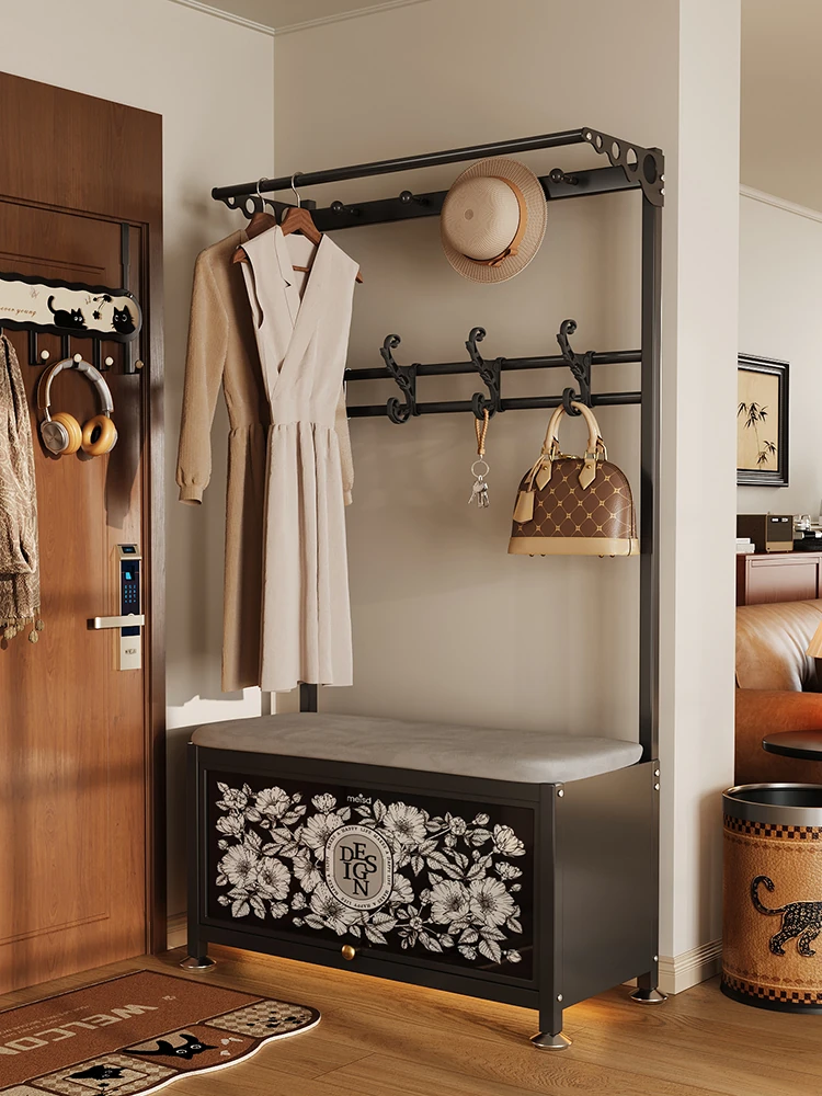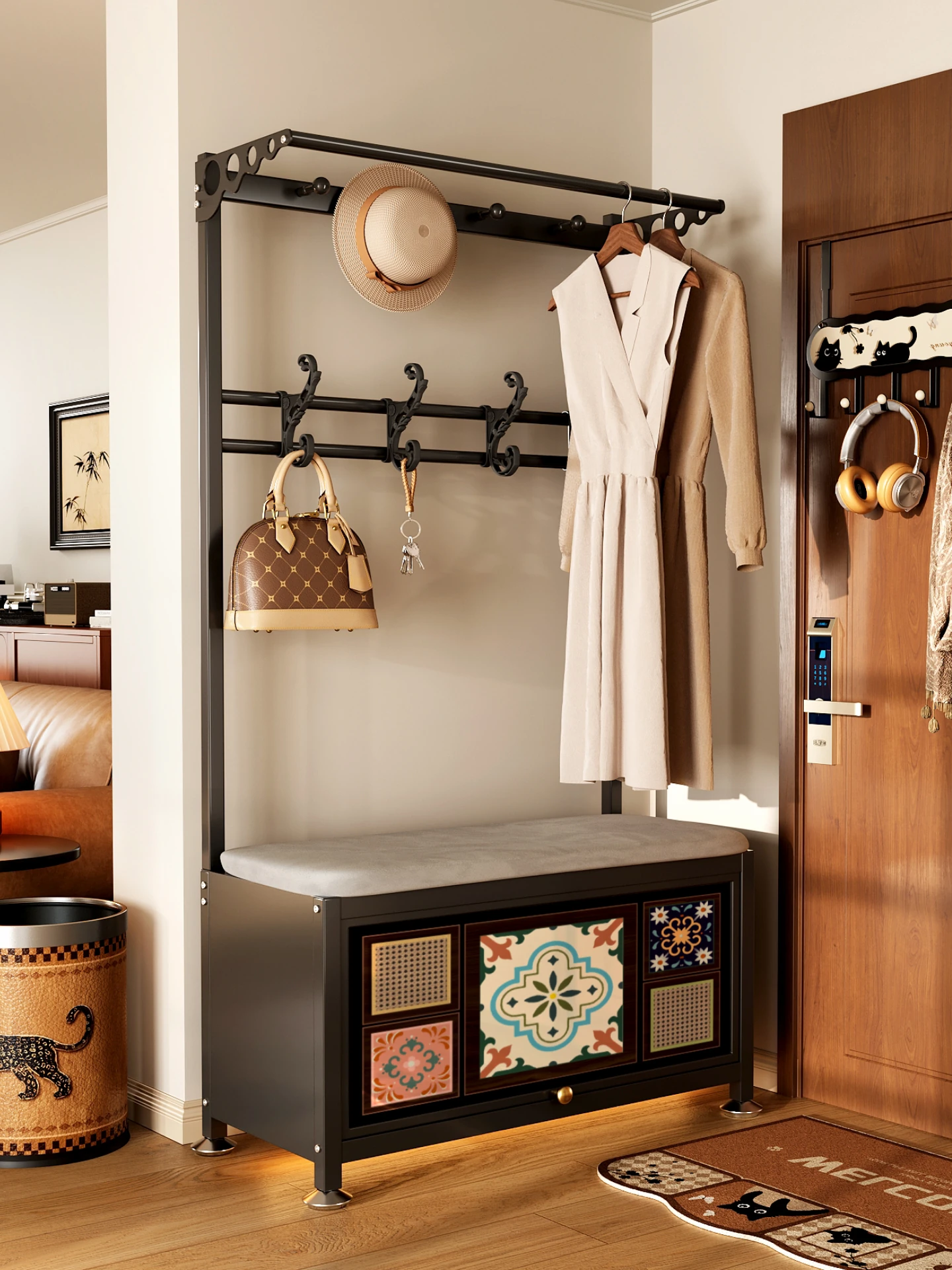 メイシーダの玄関ドア用シューズベンチ・コートハンガーセット - 高級感漂うリビングスタイル、靴を履く時の快適な座り心地と収納力を兼ね備えた一体型デザイン!