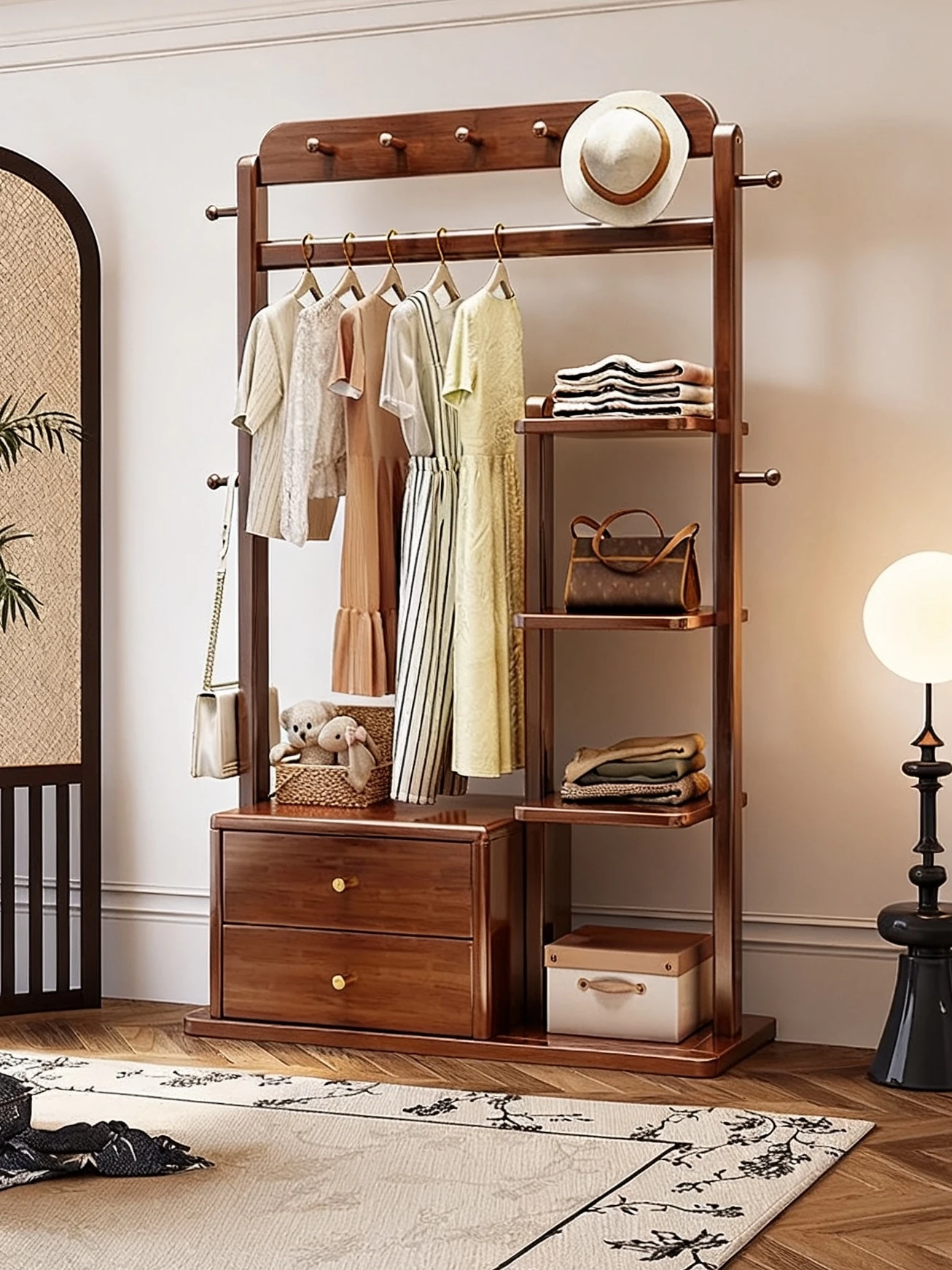 美世达の天然木製ハンガーラック - 家庭用、寝室に最適なスタンド式収納ラック!クローゼットの整理整頓をサポートし、玄関にもぴったりなデザインで、衣類や小物をしっかり収納!おしゃれで機能的な空間を演出します。